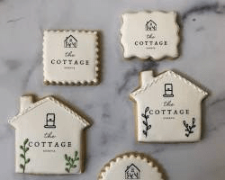 Customized sugar cookies with real estate logo .